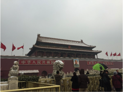 16人を5つの班に分け、それぞれの班に、日本人留学生や日本語の勉強をしている院生の方がついてくれて、班行動を心がけるように指示されました。雨がほとんど降らないという北京で今日は小さな雪が降っていました。風も強く、みんな寒そうにしていました。他の大学の仲間たちは冬の東北と聞いていたようですが、「なめていたな」と散々言っていました。私は松江にいるときと同じような服装をしていましたが、比較的に大丈夫でした。でも、ニット帽や手袋があったらなお良かったと思います。カイロがあったらもっと良かったなと思いました。バスを乗り継ぎ、地下鉄に乗って前門まで向かいました。地下鉄はみんなの意見いわく、東京のものと似ているそうです。たくさんの路線が混じり合っていて、慣れるのには時間がかかりそうだなと思いました。地下鉄の駅に入ると、まず荷物の赤外線チェックがあります。そのあとバスで使ったときと同じカードを使って乗車しました。人が多くはぐれてしまいそうになりましたが、乗り継ぎのある駅に着くと人が減り、安心できました。前门に着くと、さらに寒さが増していました。薄着だった人は本当にきつかったと思います。そんな中で院生の方がニット帽を貸してくれたり、丁先生が手袋を貸してくれたりと、中国の方の優しさを感じる瞬間があり、みんなでほっこりしていました。